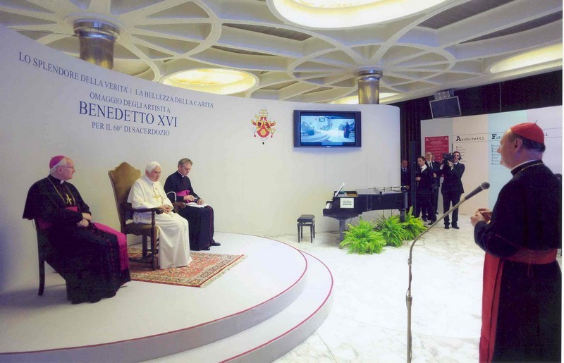 On 29 June 2011 the Holy Father Benedict XVI celebrated 60 years as a priest. To mark the occasion, Cardinal Gianfranco Ravasi followed up on an earlier meeting between the Pontif and artists in the Sistine Chapel on 21 November, and organised a Homage to the Pope by 60 Artists from the various disciplines: painting, sculpture, architecture, photography, literature and poetry, music, cinema and goldsmiths.